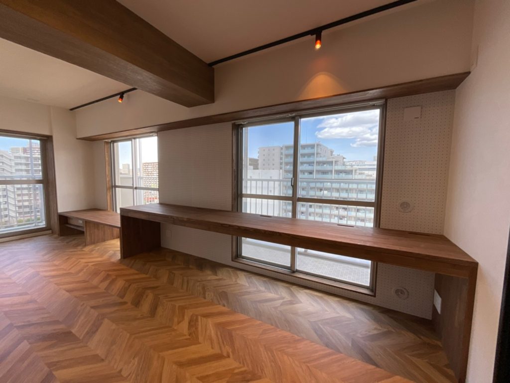 窓際には、無垢材を使用した造作のロングテーブルを設置。