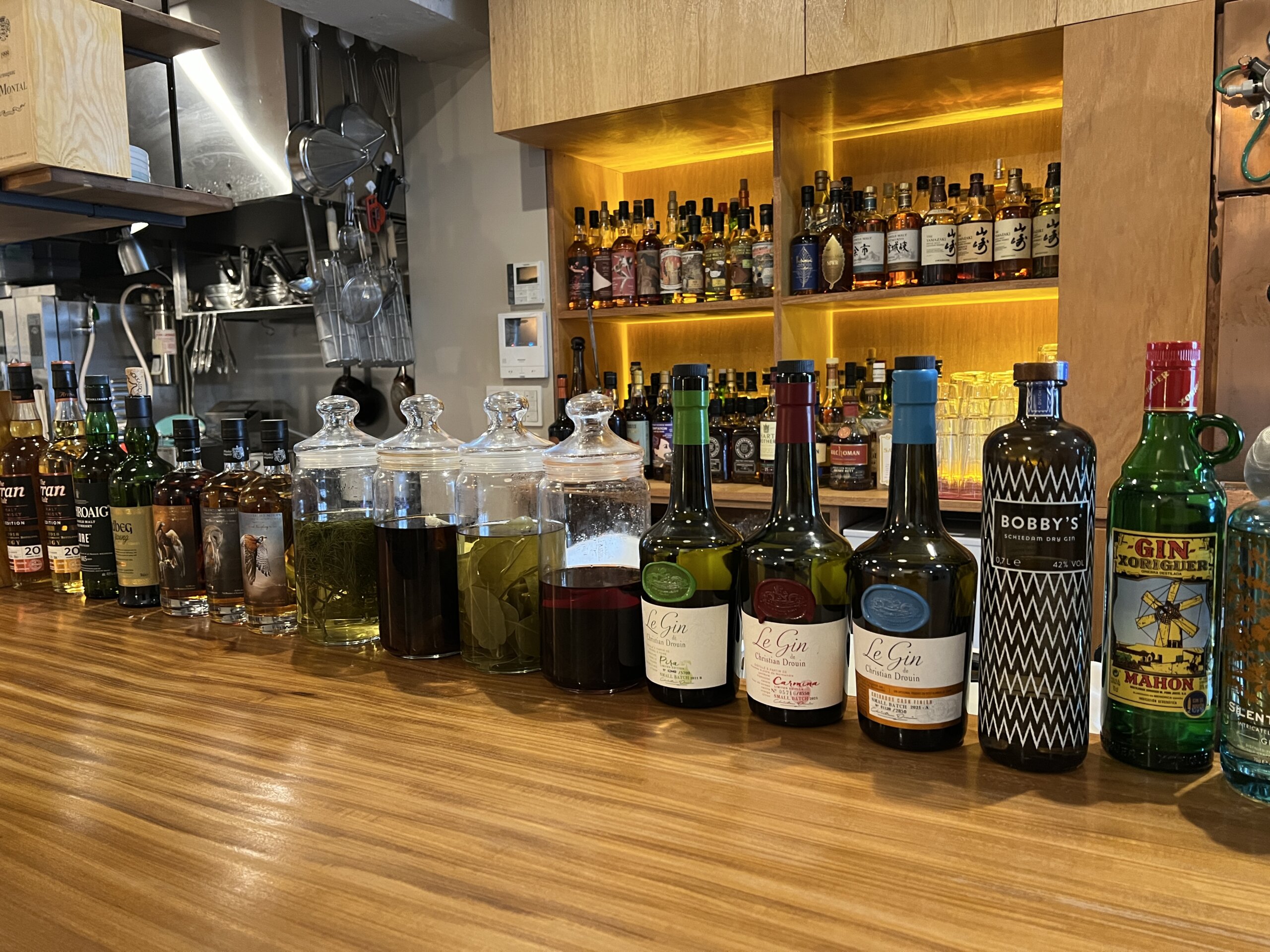 ▲カウンターには安見さんが25歳のころから集め続けたお酒が所狭しと並びます。