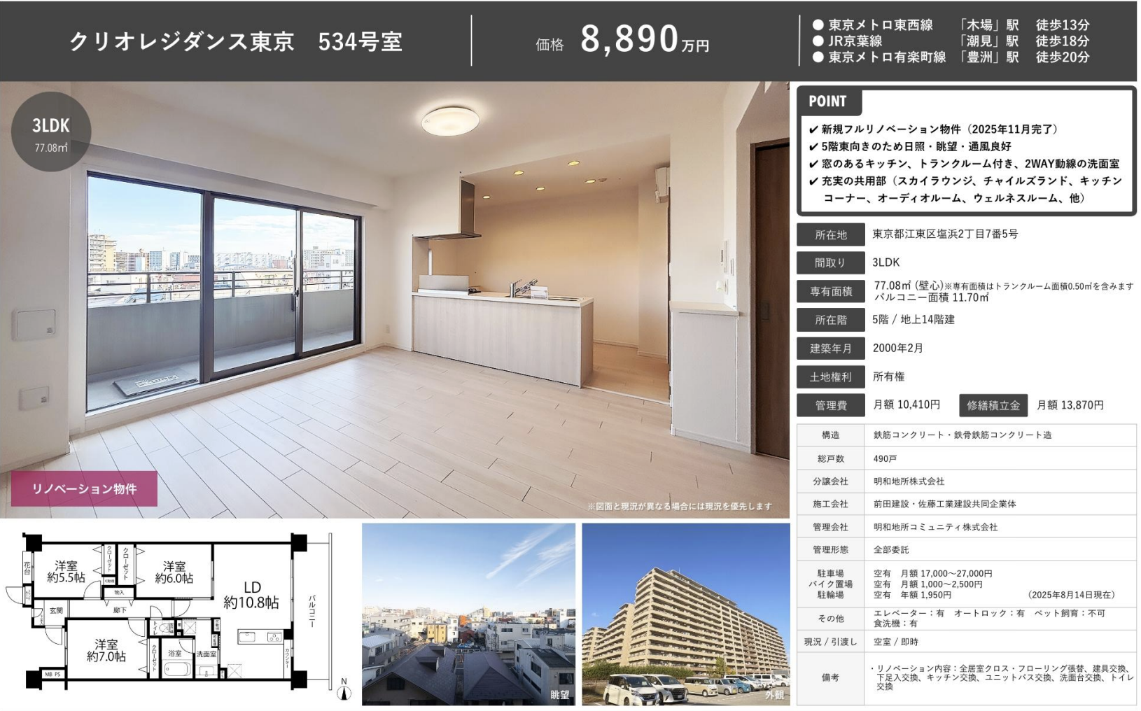 【リノベ済】400世帯以上の暮らしが広がる、都市型コミュニティ クリオレジダンス東京 77.08㎡ 3LDK 8,890万円|木場駅