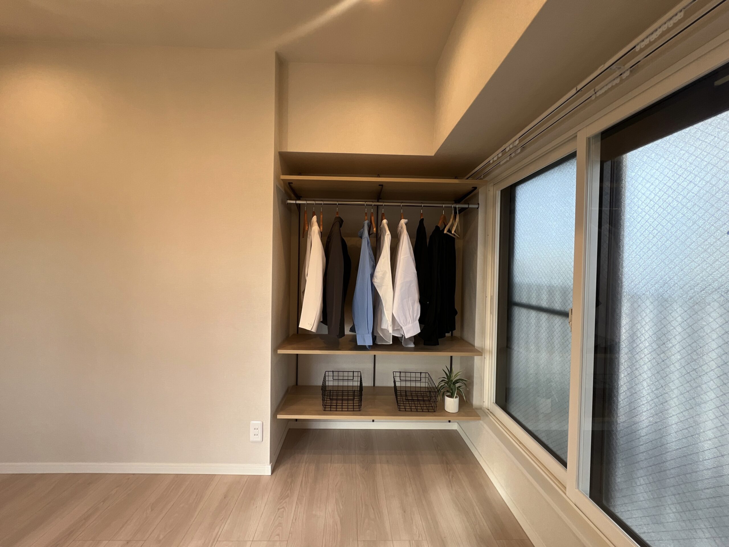 オープンクローゼットがついており、棚は可動式なので使い勝手も◎