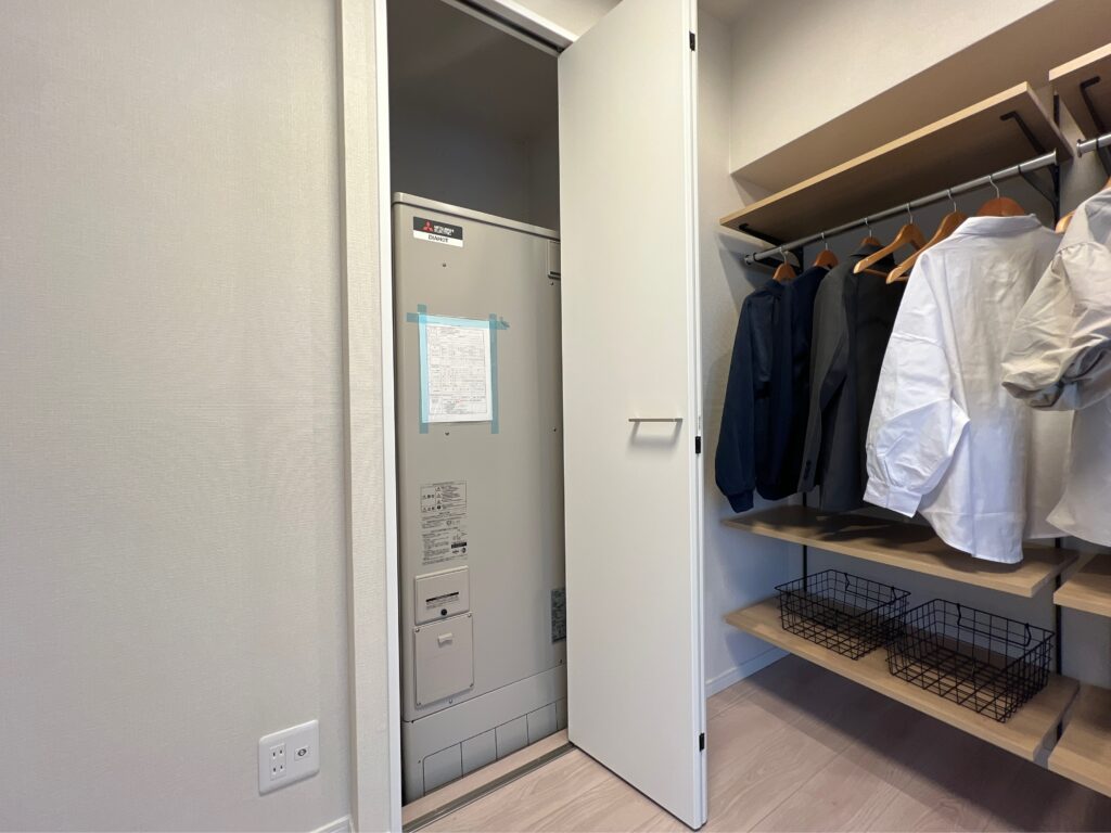クローゼットの隣には電気温水器が。ここ、実はオール電化の物件なので給湯も電気で行っています。