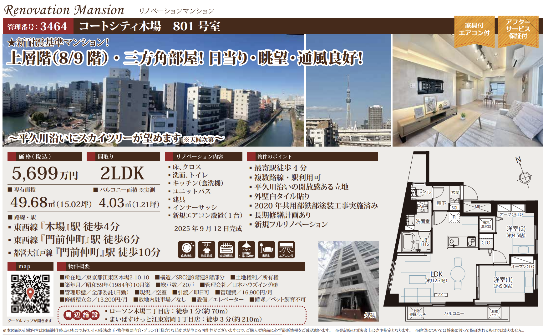 【リノベ済】木場にも門前仲町にも、安心の新耐震基準 コートシティ木場 49.68㎡ 2LDK 5,699万円|木場駅