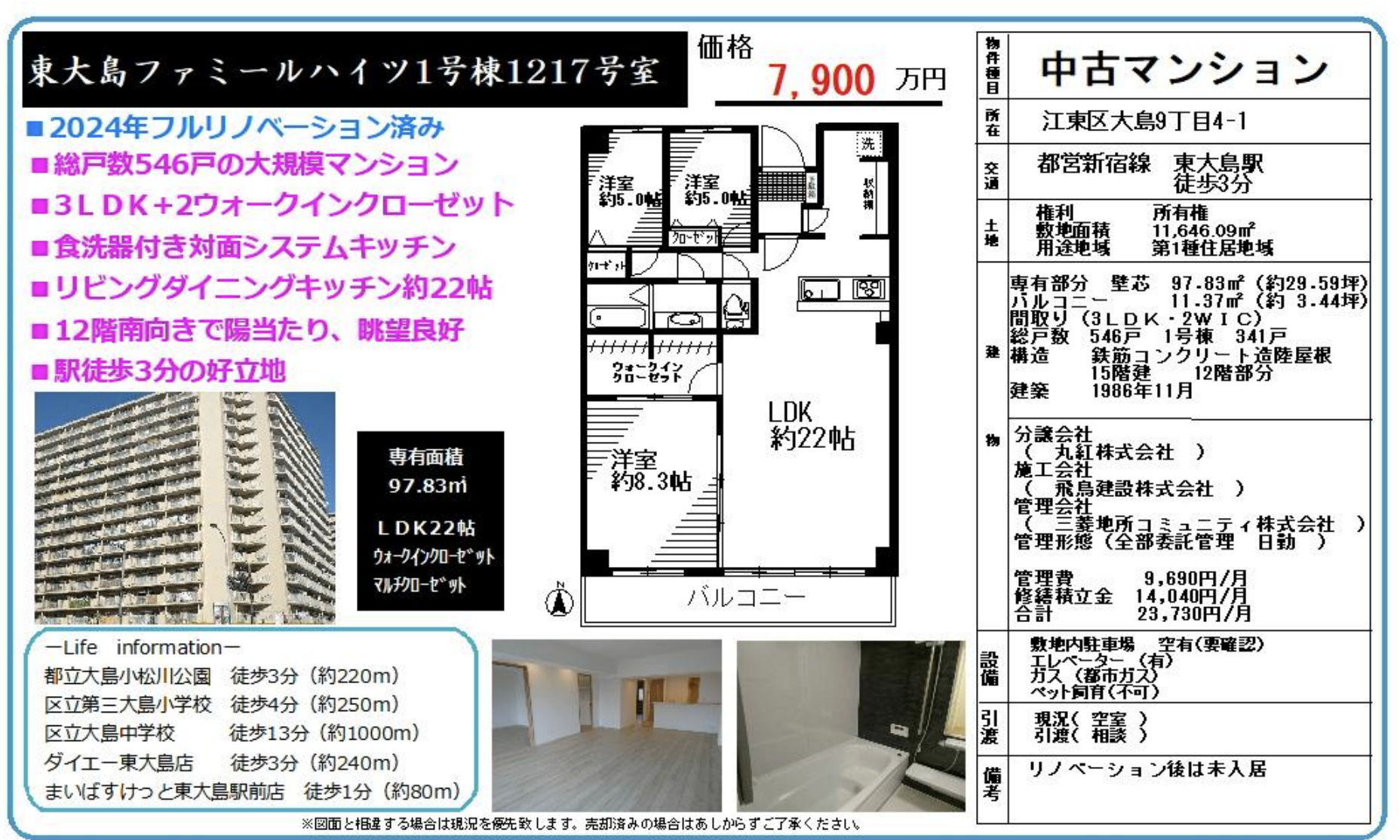 90㎡越えで広々、家族でのびのび暮らせる街 東大島ファミールハイツ1号館 97.83㎡ 3LDK 7,900万円|東大島駅