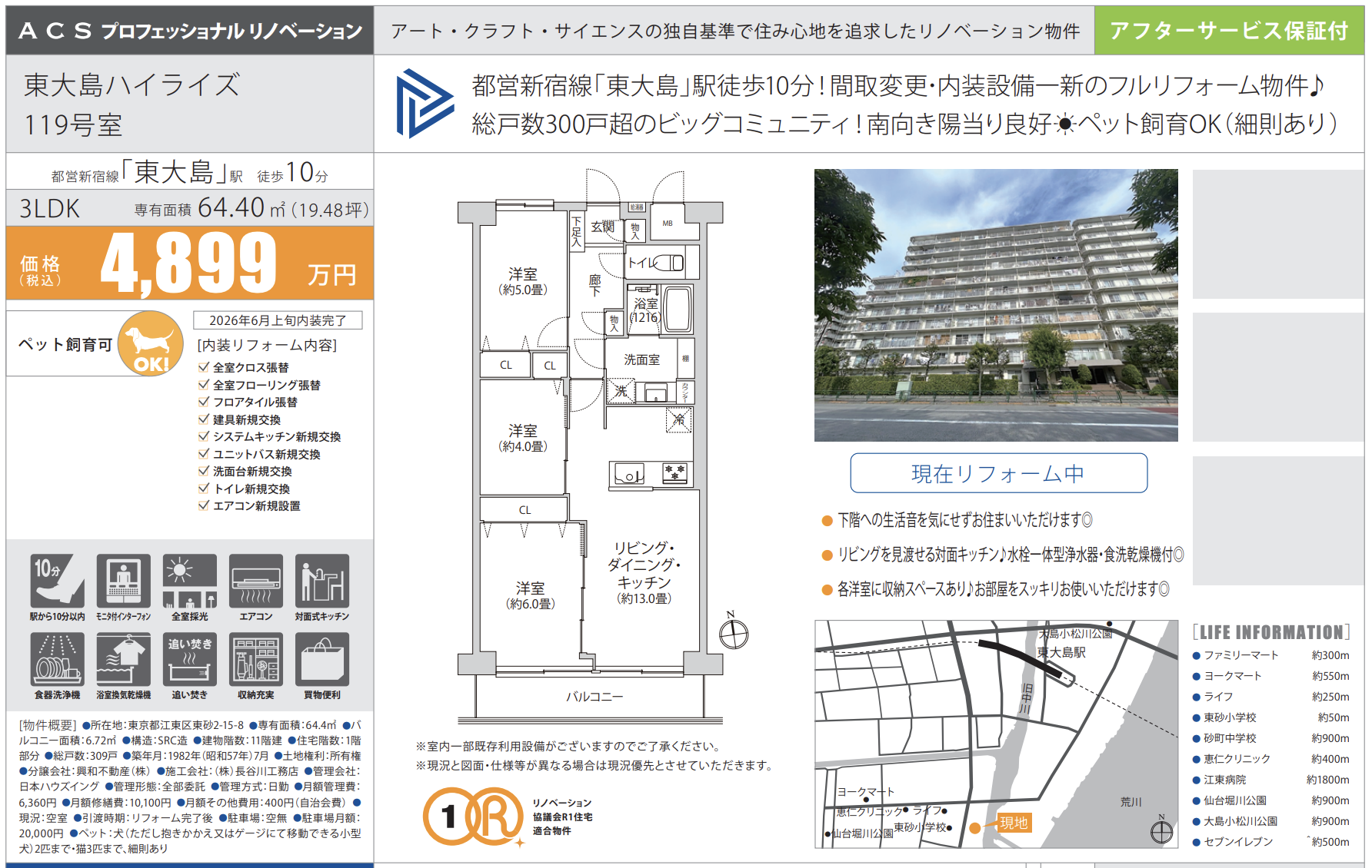 ペットと暮らせる自由な暮らし 東大島ハイライズ 66.00㎡ 3LDK 4,899万円|東大島駅