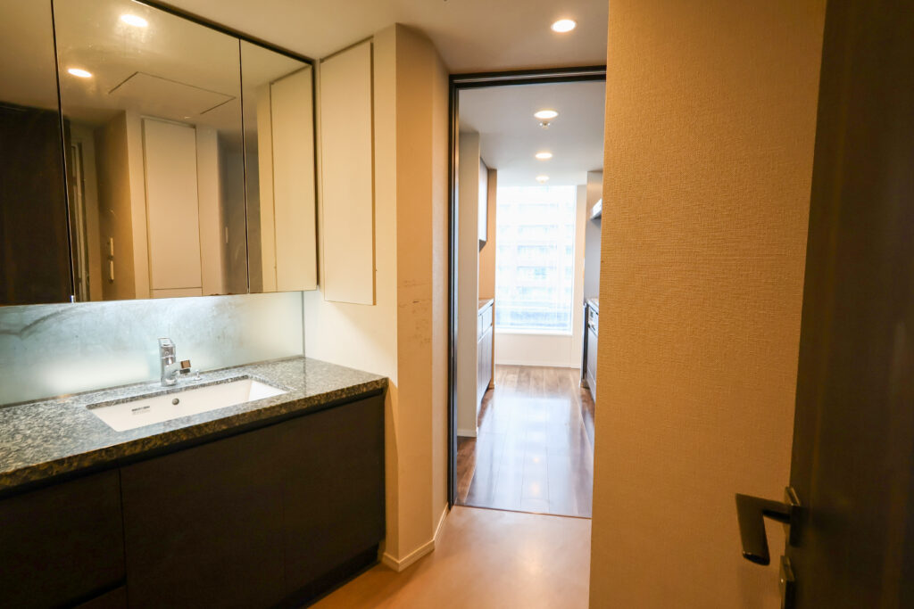 キッチンの奥に進むと洗面所があります。洗面台は大きめで使いやすそう。