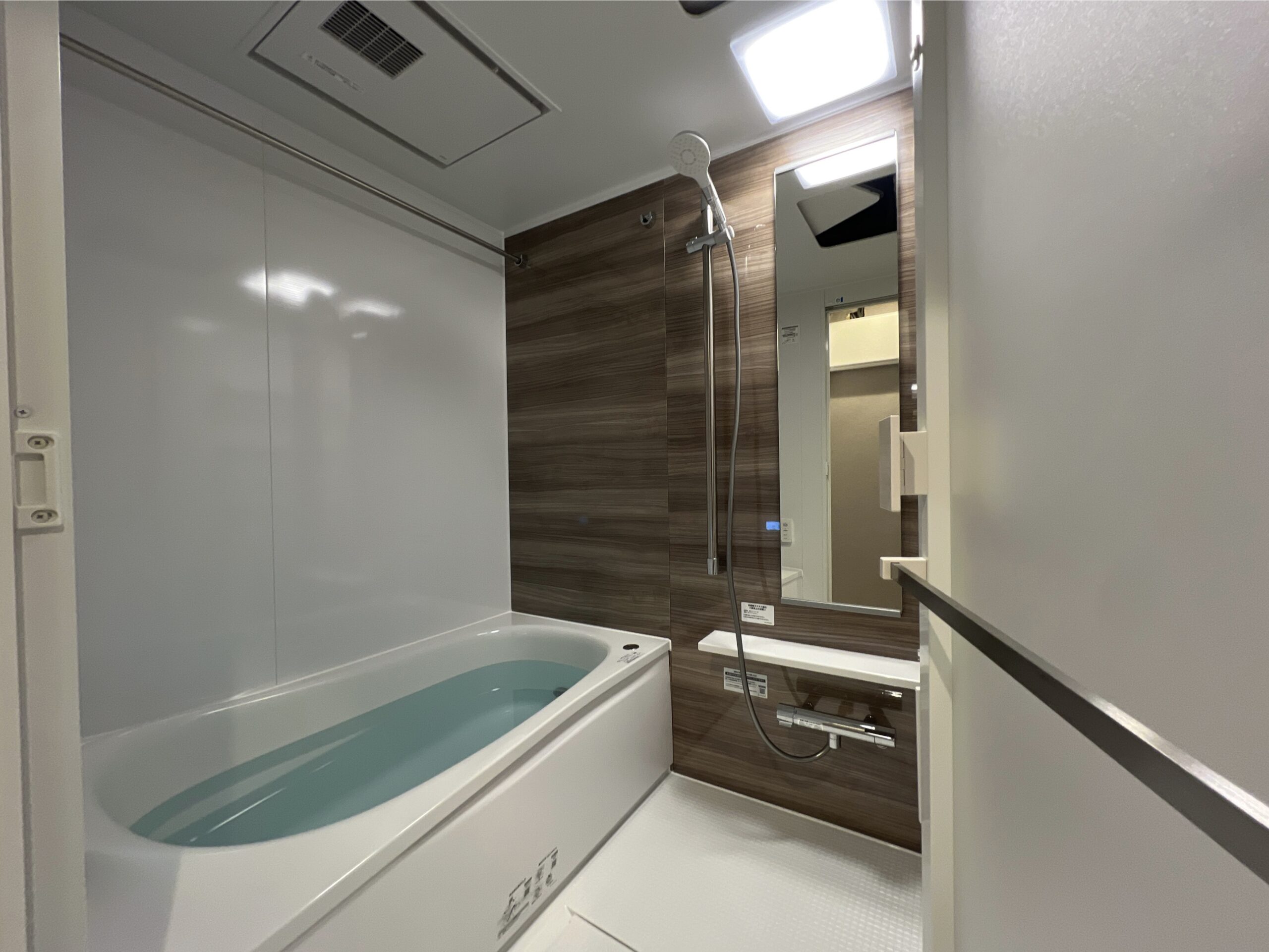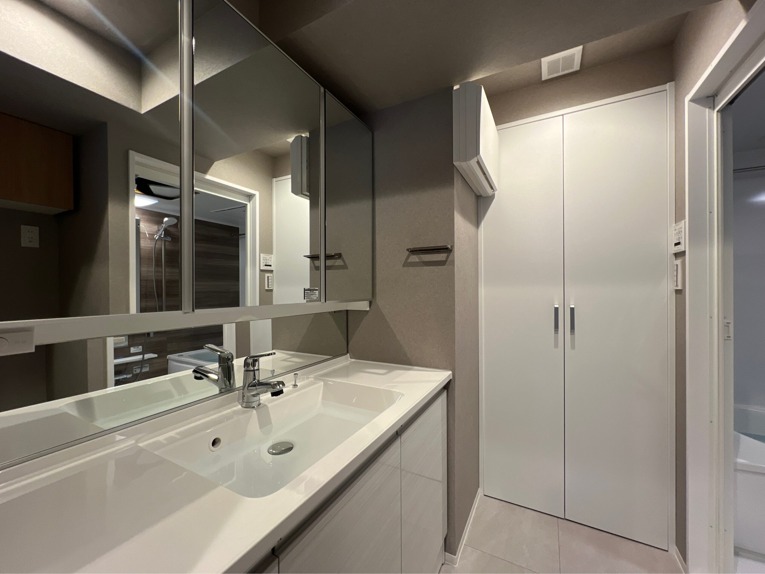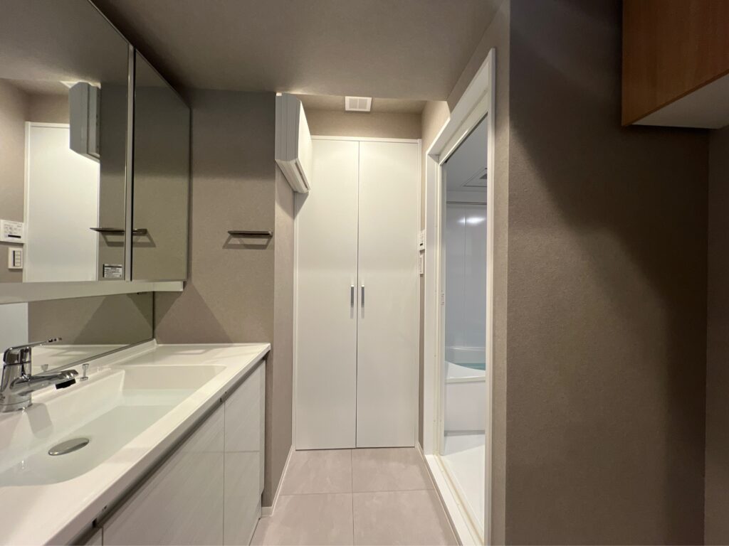 最後に水回りのご紹介です。洗面所の奥に見える扉の中には電気温水器が入っています。(給湯器と違い電気でお湯を沸かします。夜間電力で沸かすのでそこまで電気代が高額にならないのがポイントです!)