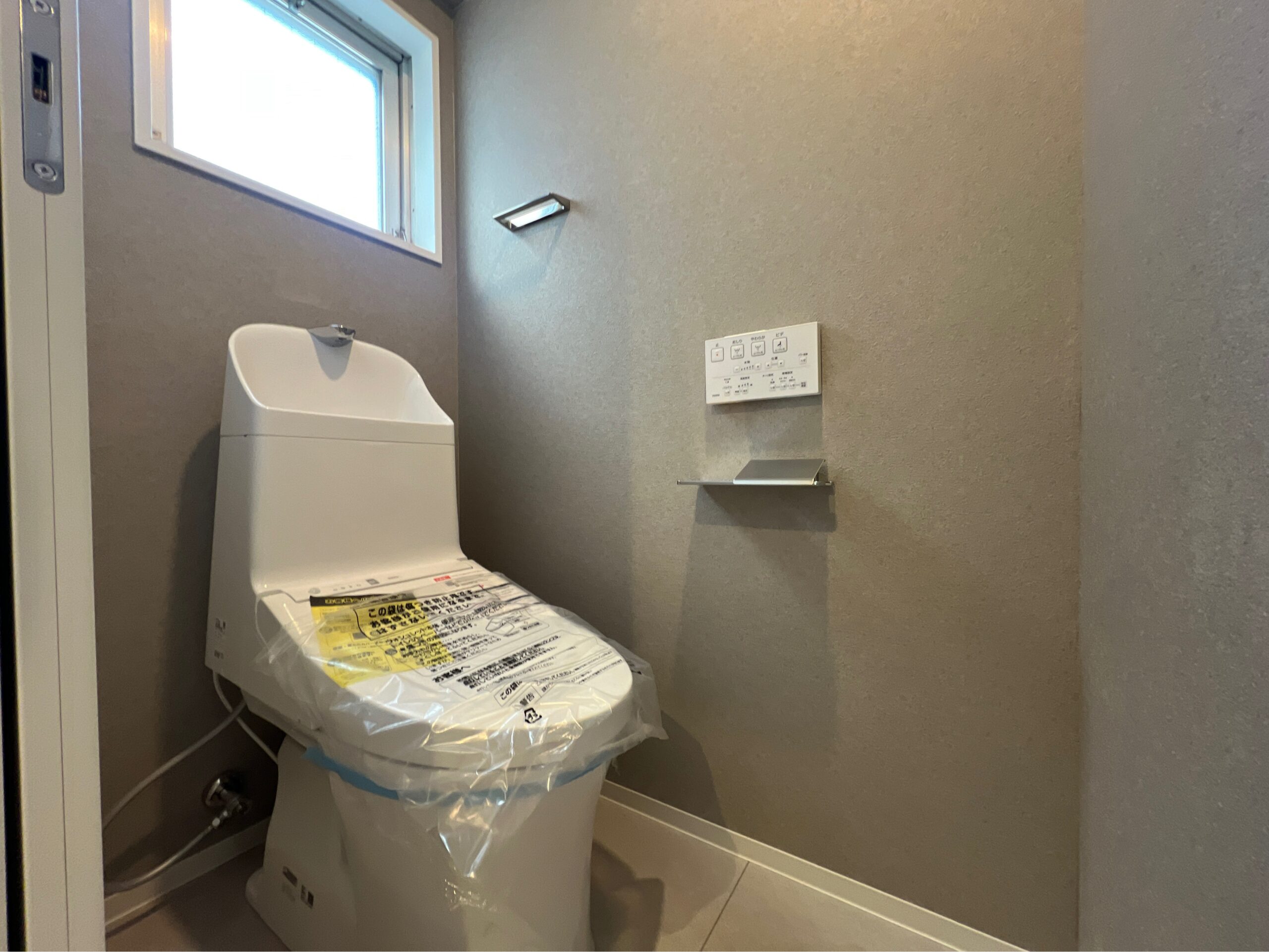 室内は明るいベージュとグレージュの壁紙がおしゃれ!落ち着いたトーンで家具も合わせやすそうです。