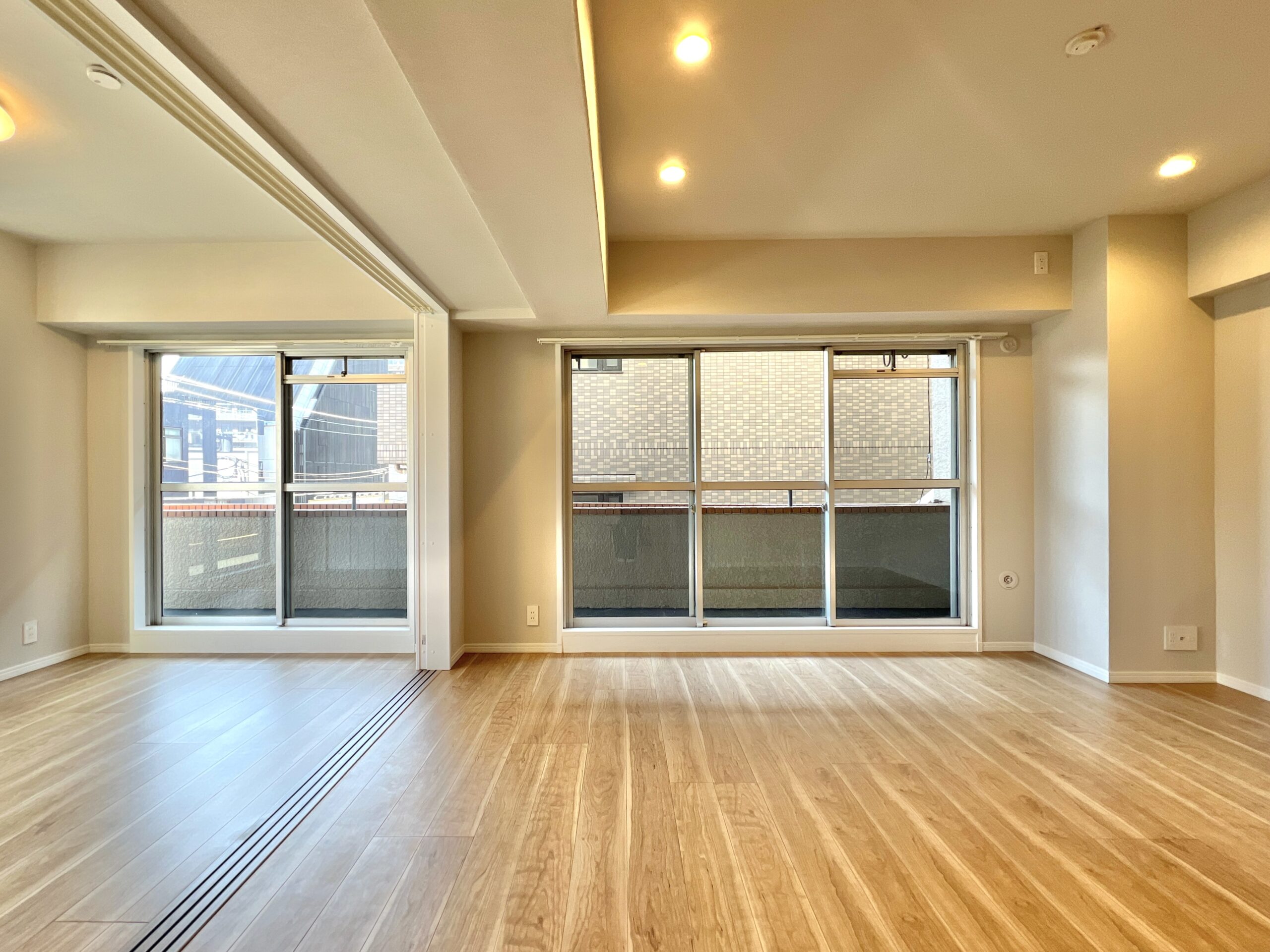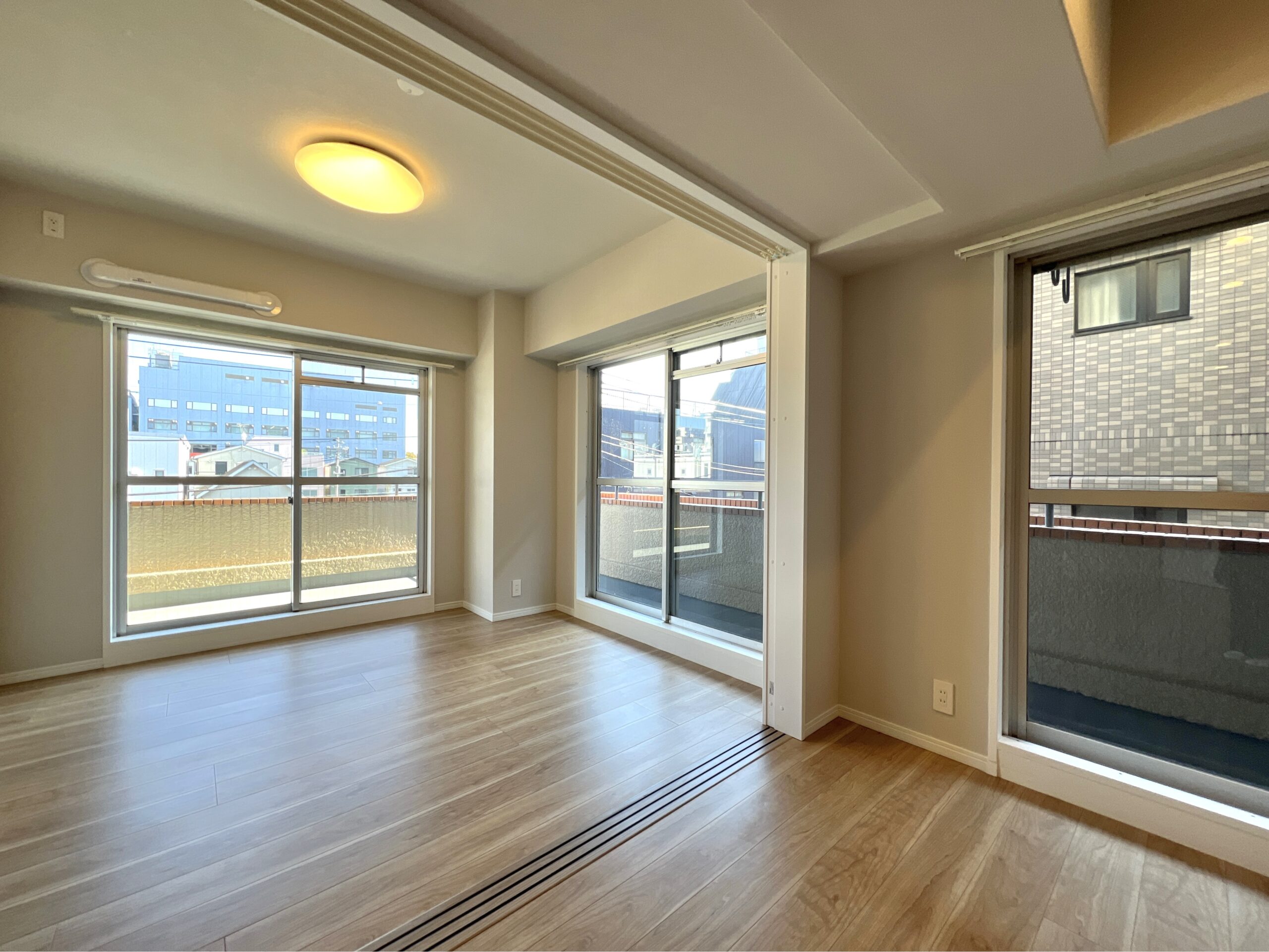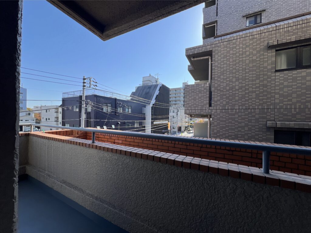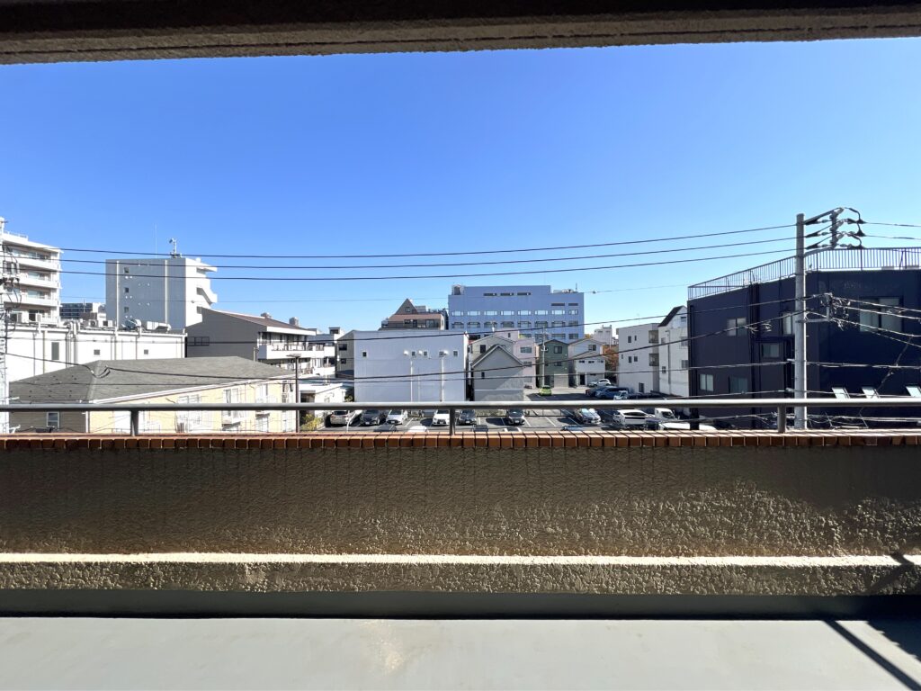 バルコニーからの眺望です。窓半分はお隣のマンションの壁があり、暗めですがもう半分からしっかり光が入ってきます。バルコニーはL字になっており、なかなか広いです!