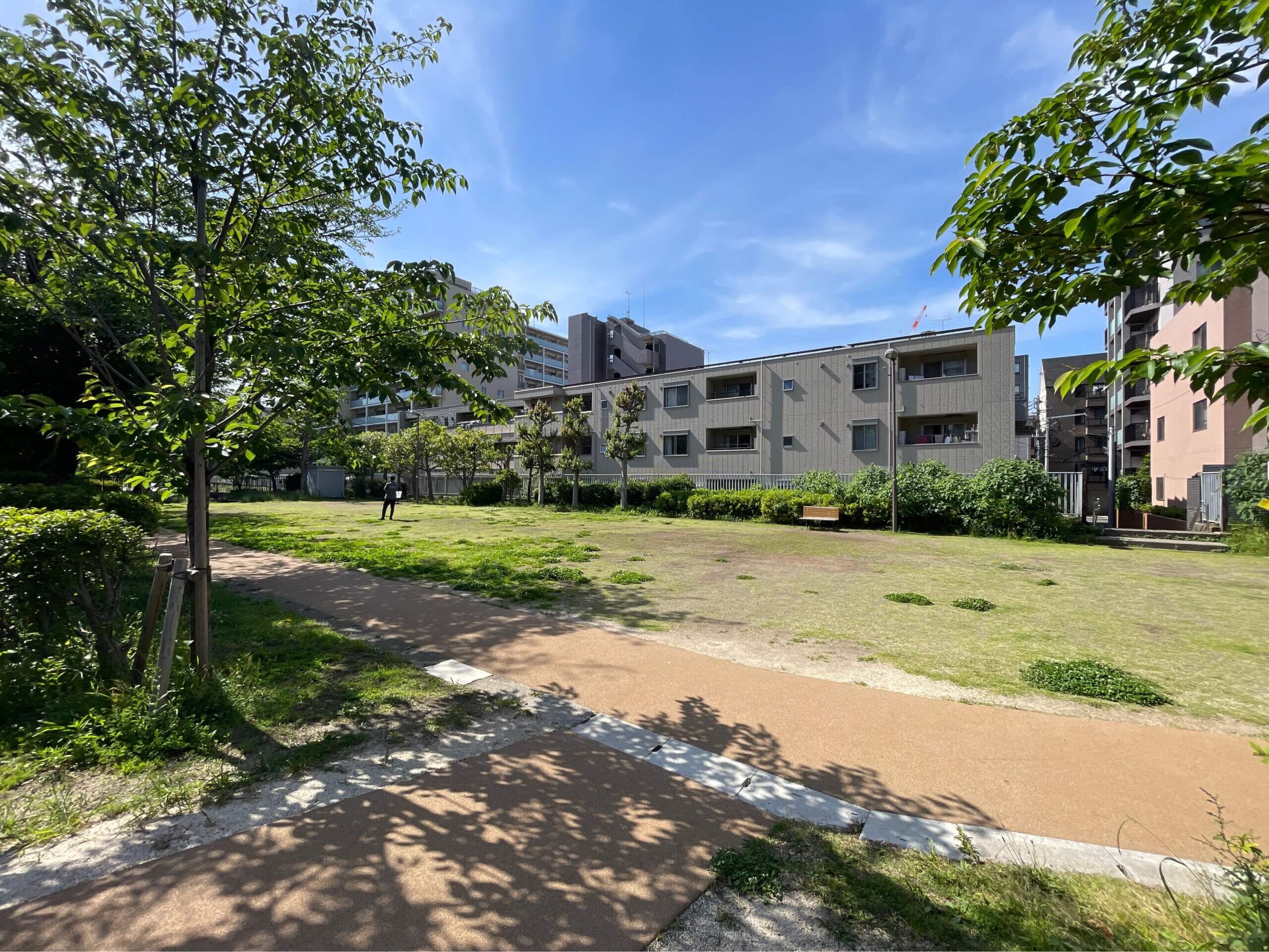 扇橋1丁目にある扇橋河川公園は、小名木川のちょうど中間地点に位置する扇橋関門近くにある遊具のない一面グラウンドの公園です。