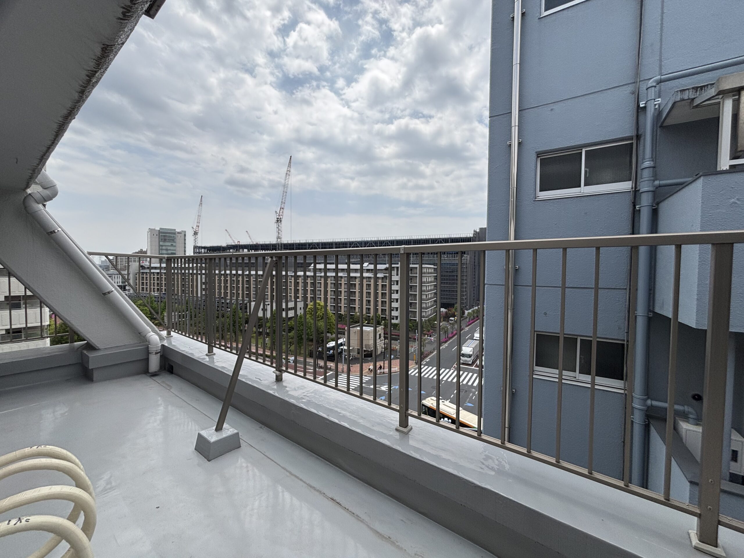 共用廊下はこんな感じ。スカイツリーの先っぽが見えます。