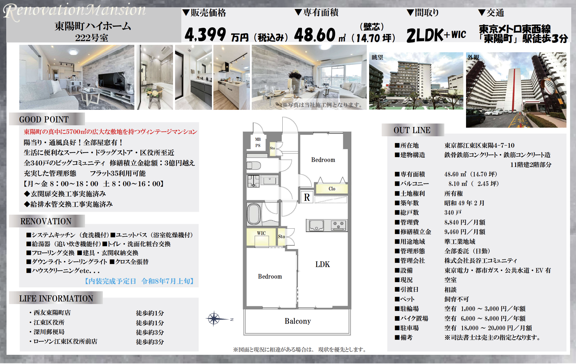 東陽町駅すぐそばのヴィンテージマンション 東陽町ハイホーム 48.60㎡ 2LDK 4,399万円|東陽町駅